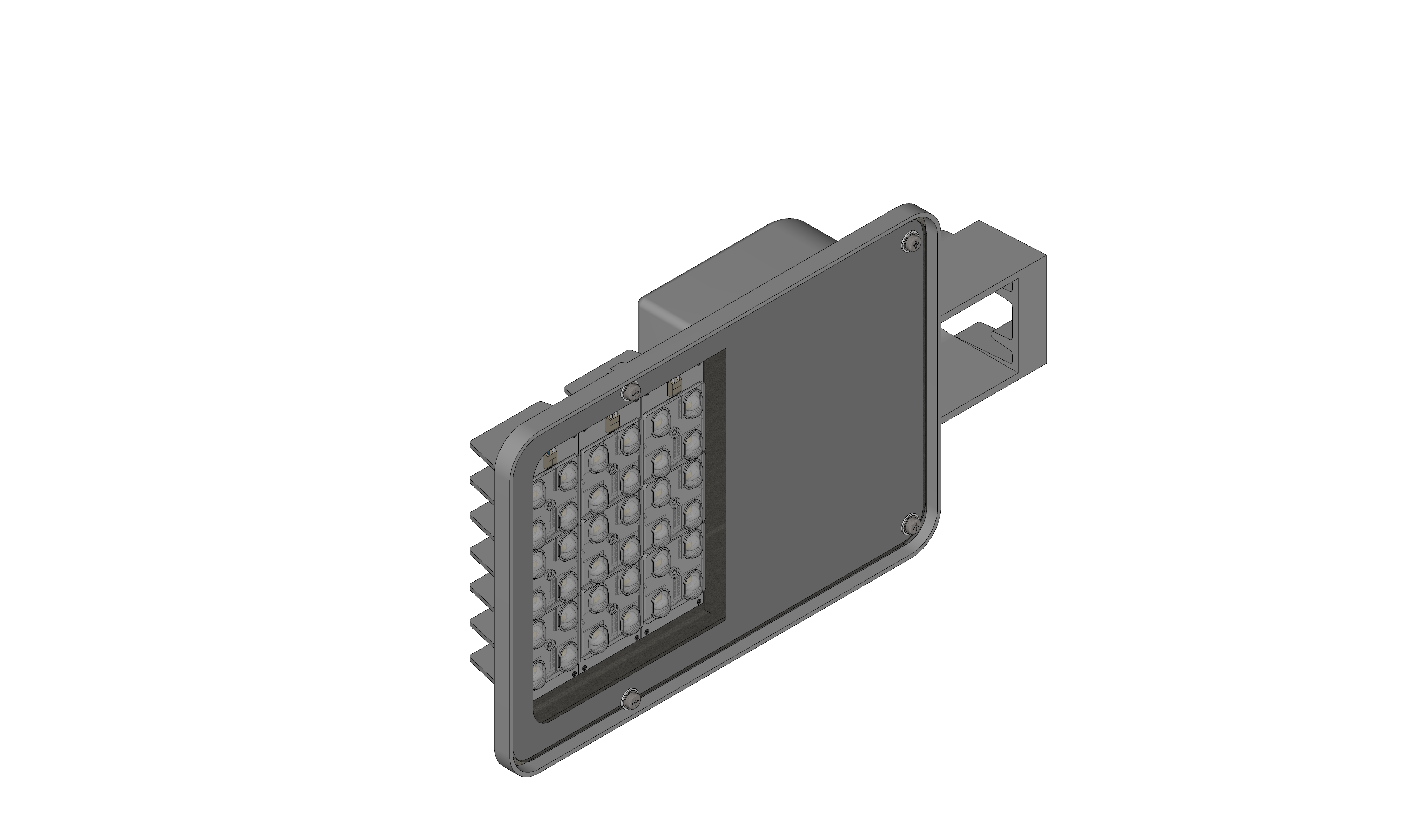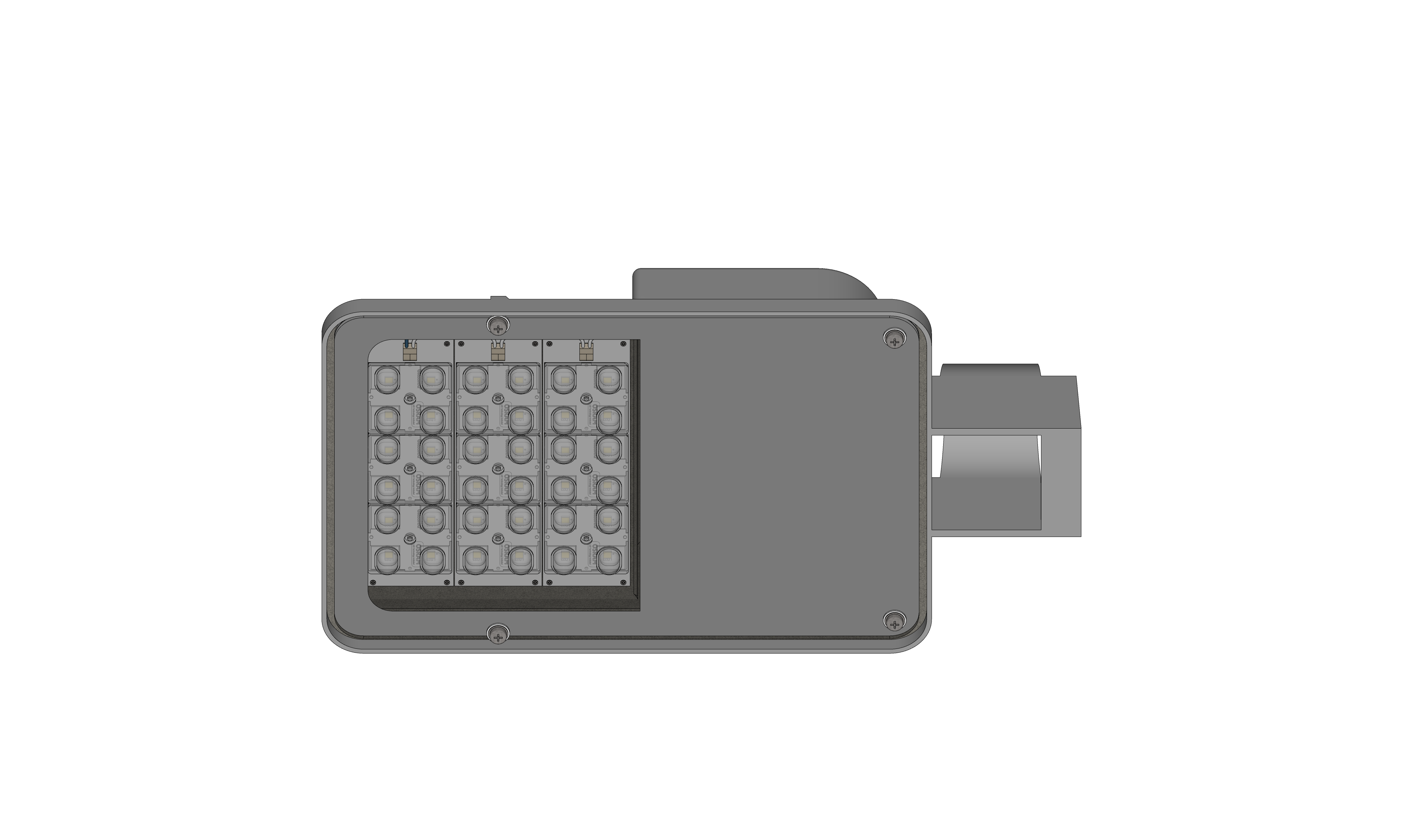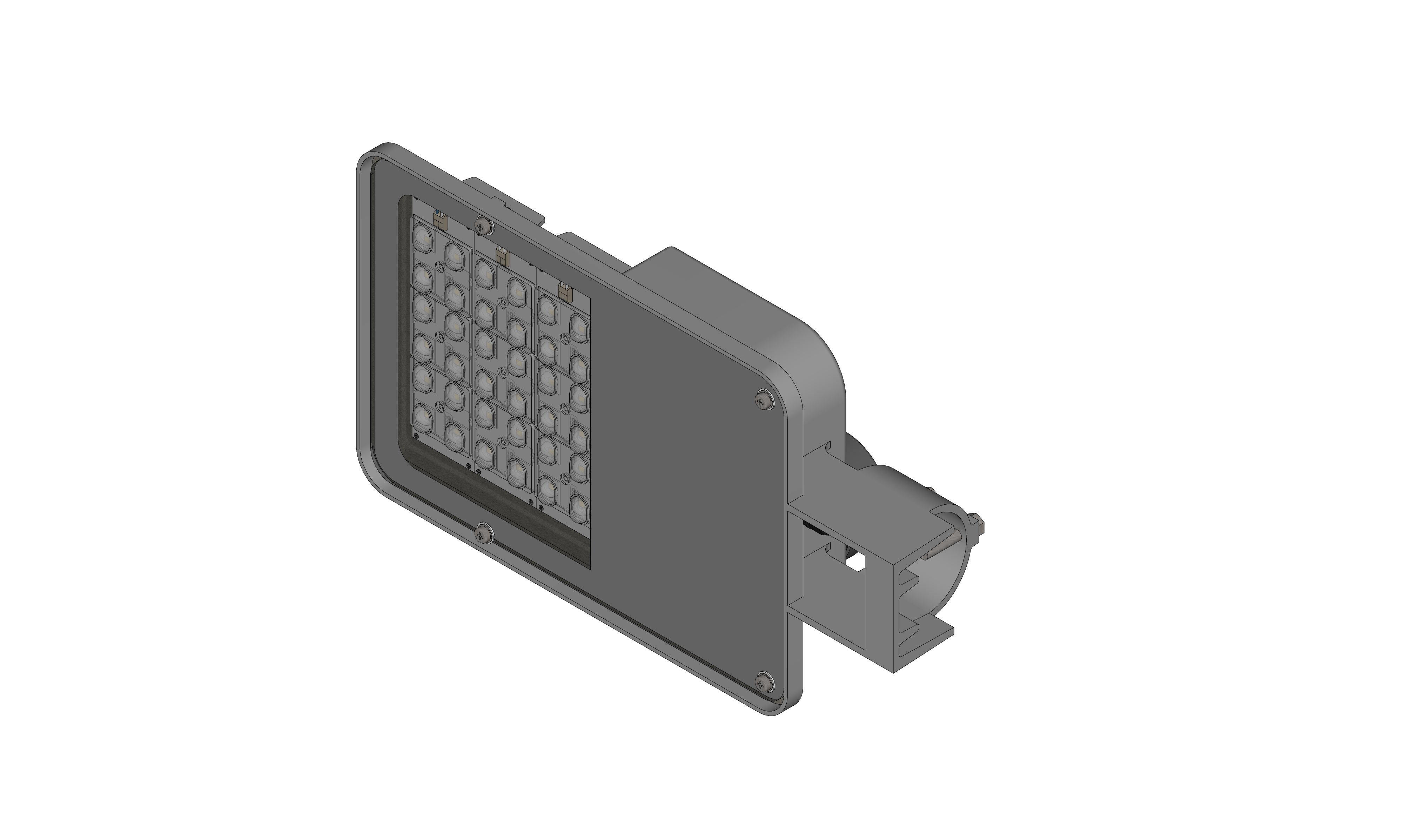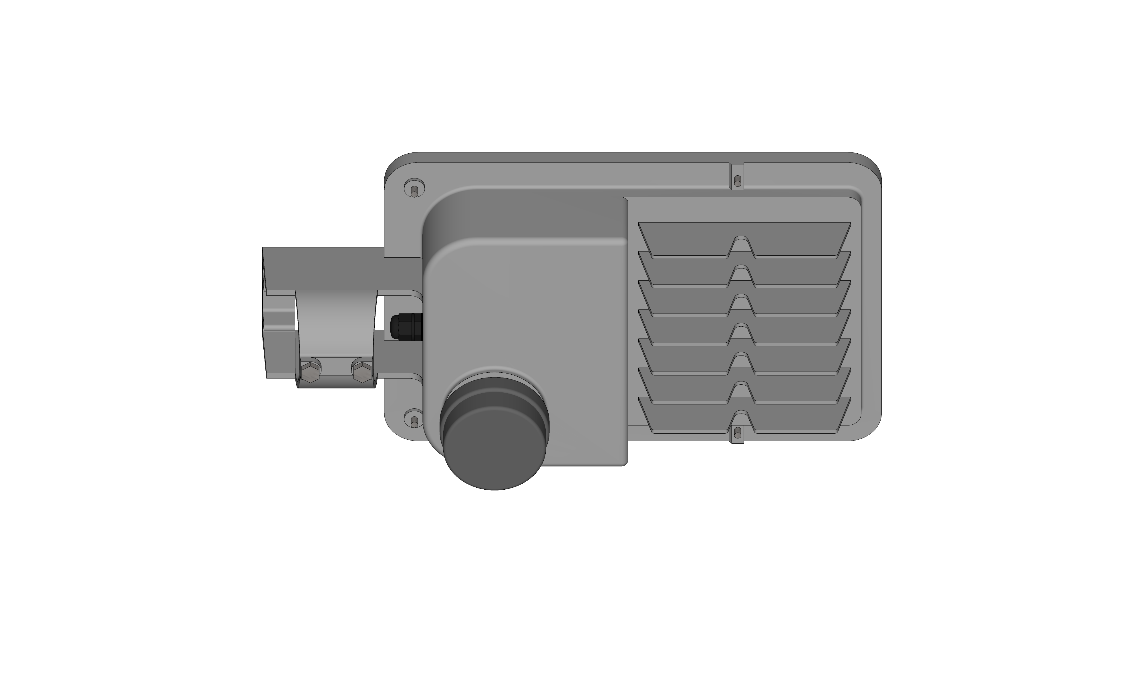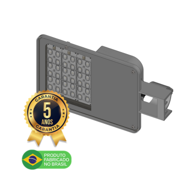 LUMINÁRIA PÚBLICA EM CORPO COM ALOJAMENTO INTEGRADO PARA O CONTROLADOR EM LIGA DE ALUMÍNIO SAE-329, FUNDIDO A BAIXA PRESSÃO COM PARAFUSOS, PORCAS E ARRUELAS EM AÇO INOX E LENTE EM PMMA ASSIMÉTRICA.