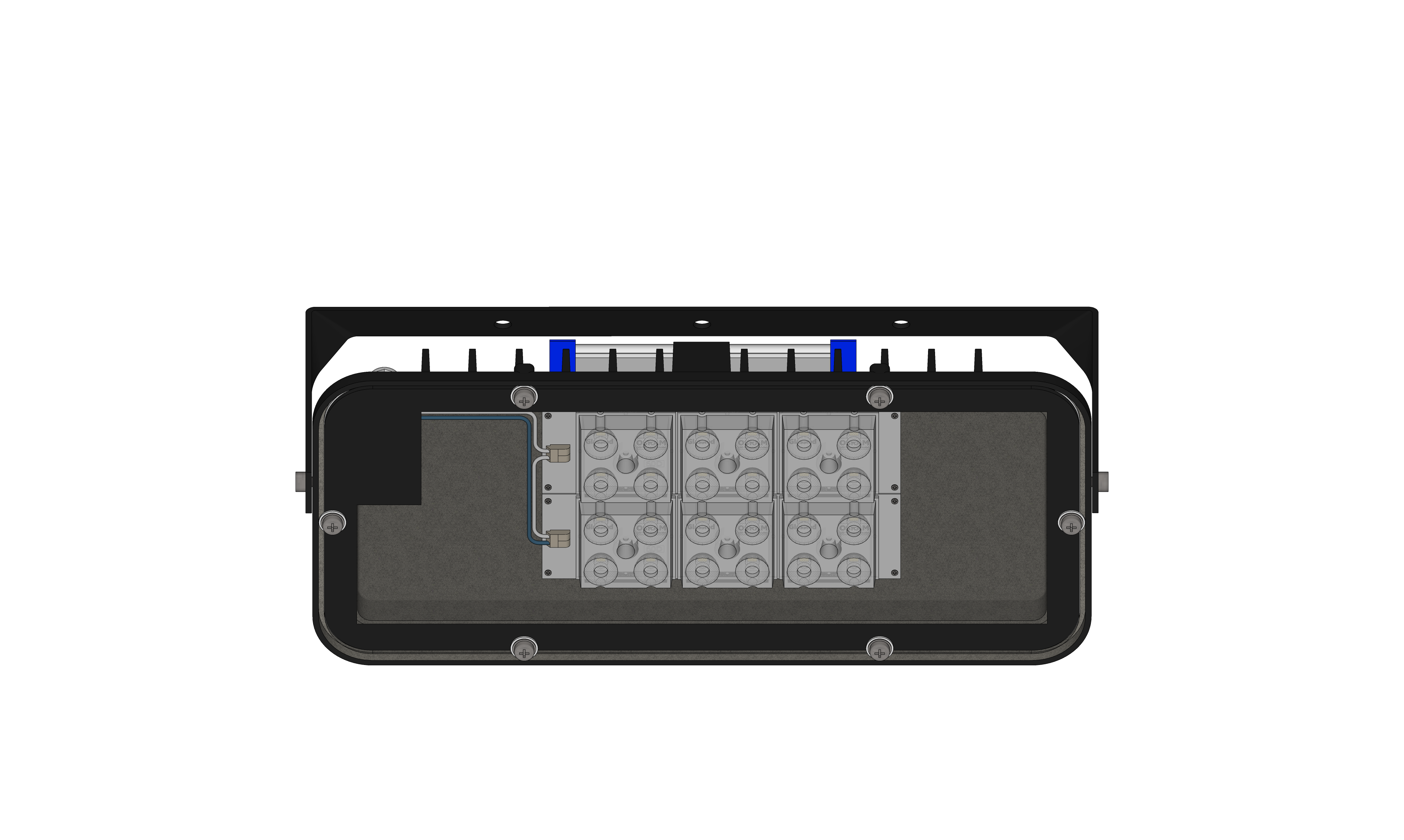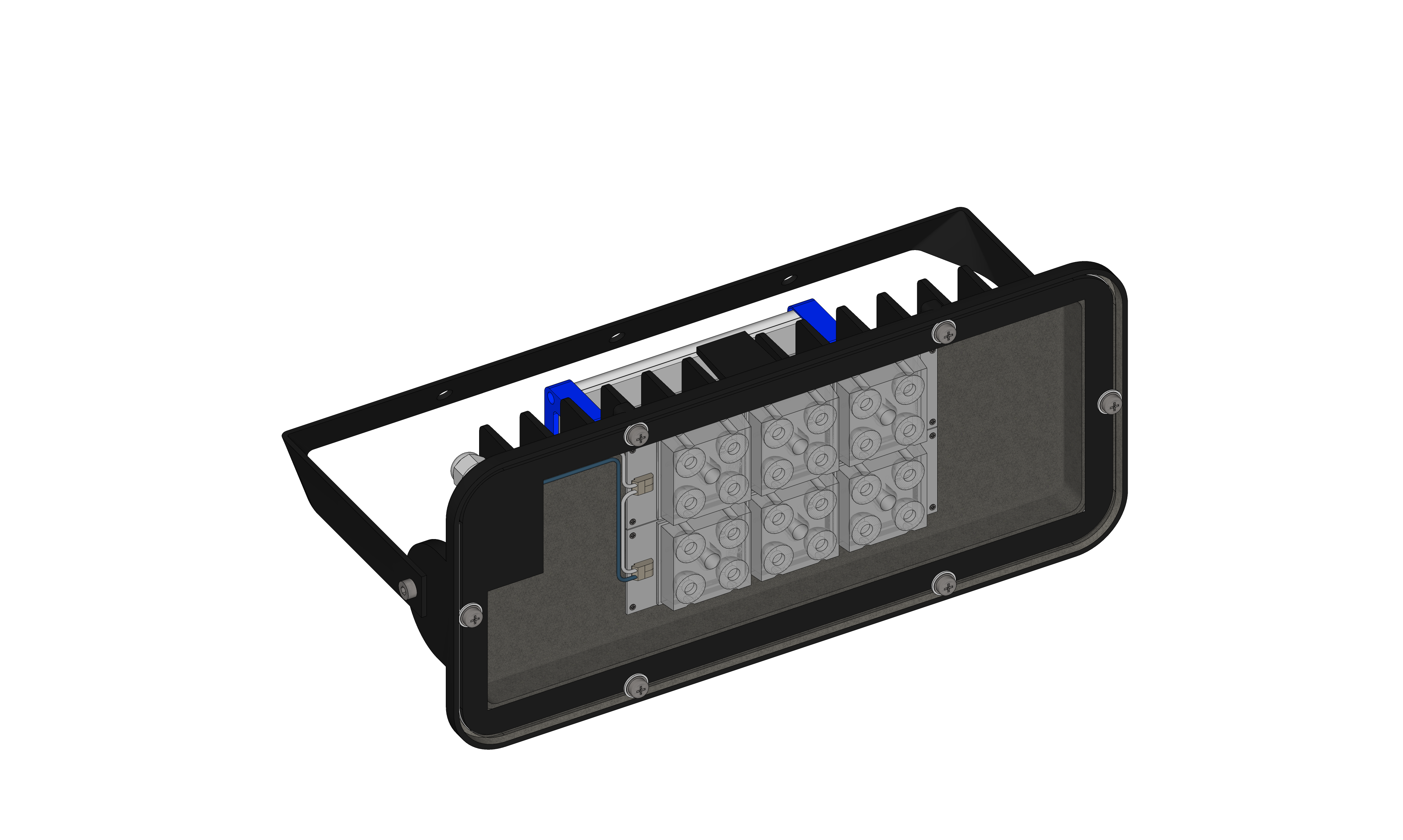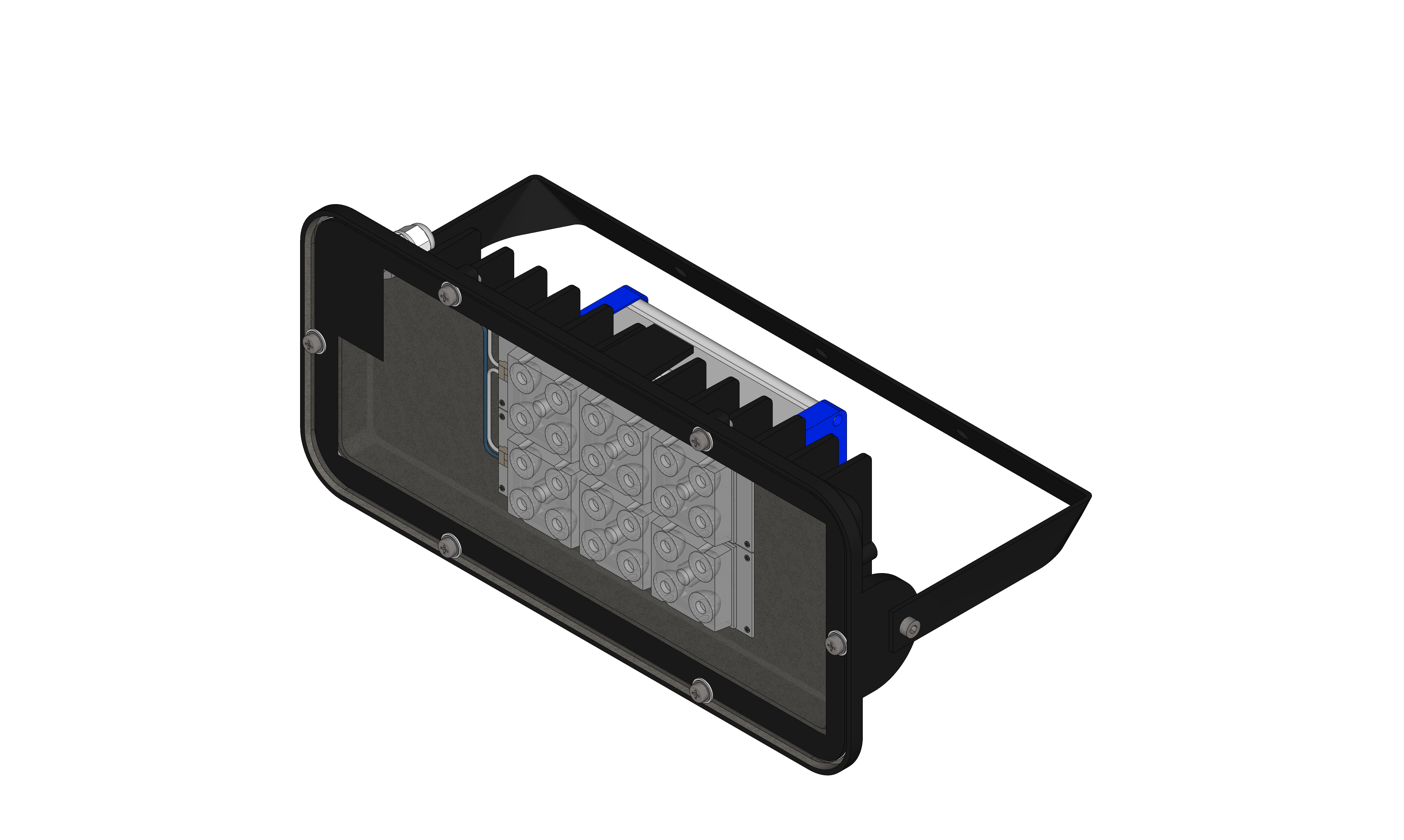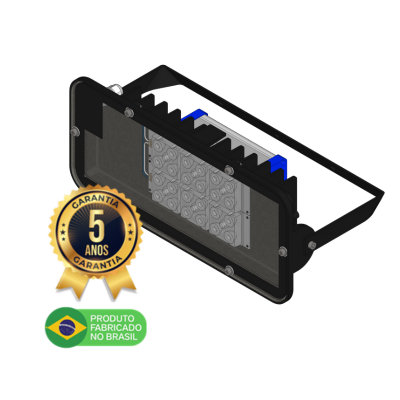 REFLETOR EM LIGA DE ALUMÍNIO SAE-329 FUNDIDO A BAIXA PRESSÃO, PLACA DE LED SMD, PARAFUSOS, PORCAS E ARRUELAS EM AÇO INOX, LENTE PLANA DE CRISTAL TEMPERADO 4MM E ACABAMENTO EM PINTURA ELETROSTÁTICA TEXTURIZADA E LENTE ÓPTICA EM PMMA COM ADITIVADO DE RAIOS UTRAVIOLETA UV E EFICIÊNCIA DE 94%.